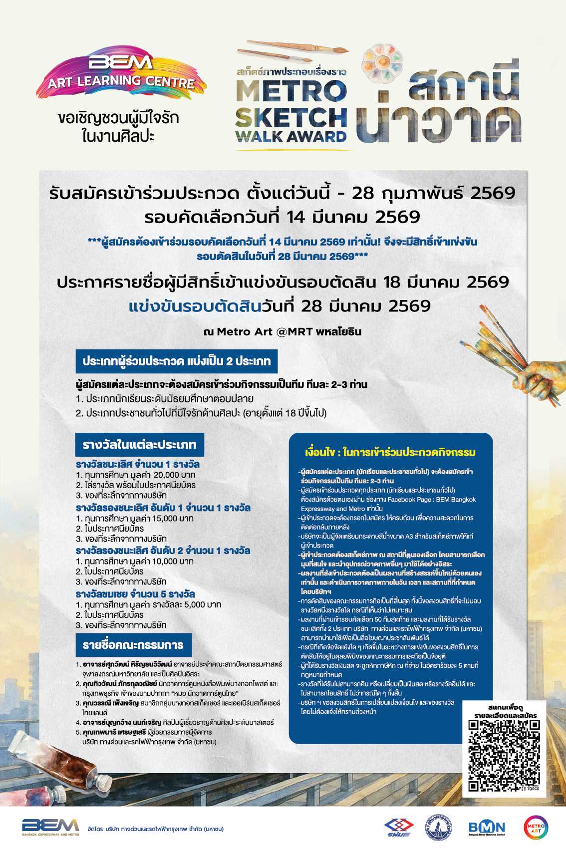บริษัท ทางด่วนและรถไฟฟ้ากรุงเทพ จำกัด (มหาชน) หรือ BEM ขอเชิญผู้ที่สนใจร่วมเปลี่ยนเส้นทางคุ้นเคยให้กลายเป็นแรงบันดาลใจใหม่ ในกิจกรรมประกวด BEM Art Contest ภายใต้แนวคิด “Metro Sketch Walk Award สถานีน่าวาด” เพื่อเปิดพื้นที่ให้เยาวชน นักเรียน นักศึกษา และประชาชนทั่วไป ได้ถ่ายทอดความสวยงามและเรื่องราวรอบสถานีรถไฟฟ้า MRT ผ่านการสเก็ตช์ภาพ ณ สถานที่จริงเปลี่ยนโมเมนต์ระหว่างทางให้กลายเป็นภาพวาดสีน้ำที่มีเรื่องราว