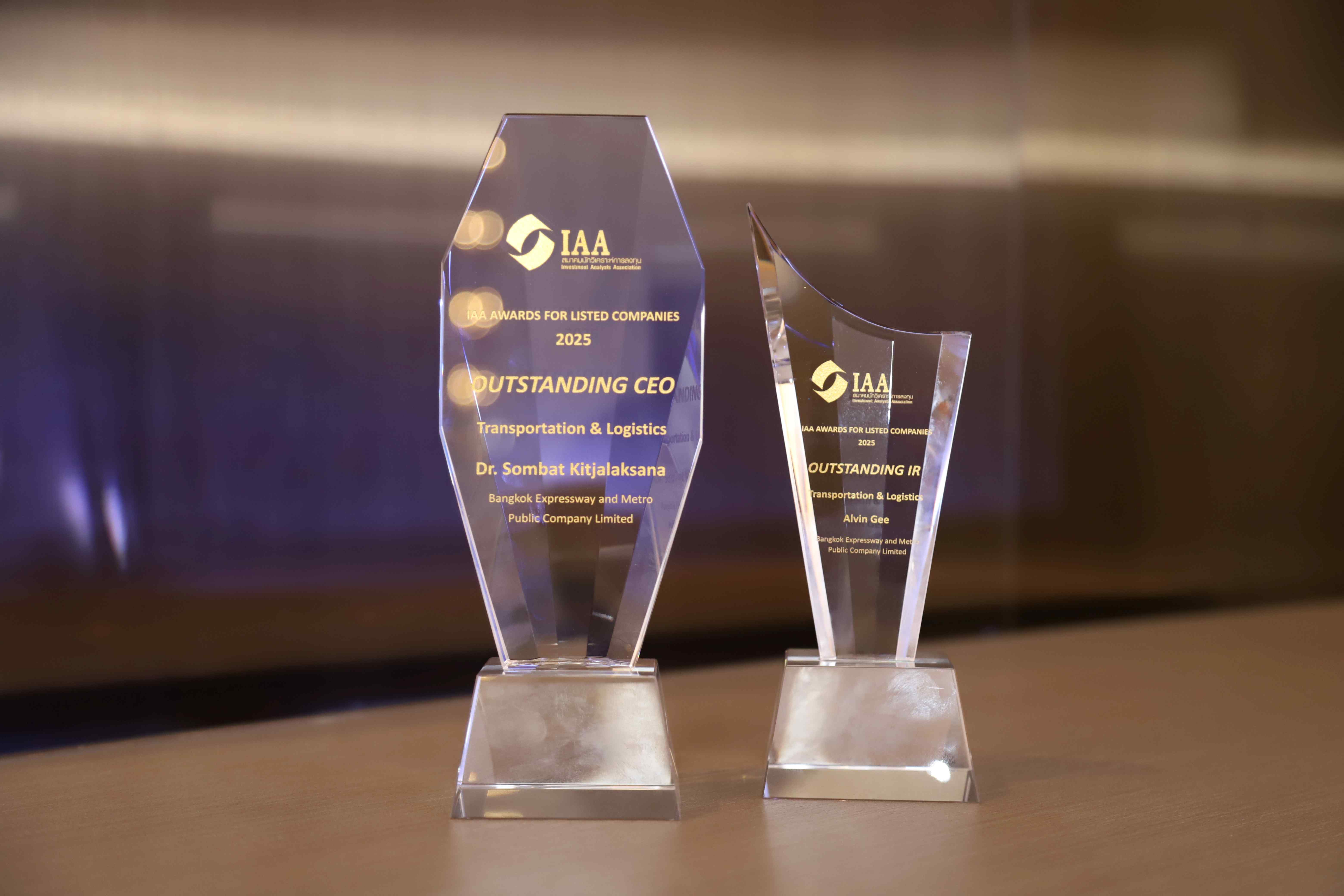 บริษัท ทางด่วนและรถไฟฟ้ากรุงเทพ จำกัด (มหาชน) หรือ BEM คว้า 2 รางวัลเกียรติยศ “Outstanding CEO และ Outstanding IR” ในกลุ่มอุตสาหกรรมขนส่งเดินทาง จากเวที IAA Awards for Listed Companies 2025 จัดโดยสมาคมนักวิเคราะห์การลงทุน (IAA) รางวัลดังกล่าวสะท้อนถึงศักยภาพและ ความเป็นเลิศของผู้บริหารและบริษัทจดทะเบียนมีศักยภาพที่โดดเด่น ในการบริหารธุรกิจตามหลักบรรษัทภิบาล พร้อมทั้งดำเนินงานด้านนักลงทุนสัมพันธ์อย่างมีประสิทธิภาพ ด้วยการสื่อสารข้อมูลที่โปร่งใส สร้างความเชื่อมั่นและความสัมพันธ์ที่ดีในระยะยาว โดยนายอัลวิน จี รองกรรมการผู้จัดการ เป็นผู้แทนรับมอบรางวัลจาก ดร.เอกนิติ นิติทัณฑ์ประภาศ รองนายกรัฐมนตรีและรัฐมนตรีว่าการกระทรวงการคลัง ณ โรงแรม อีสติน แกรนด์ พญาไท เมื่อเร็วๆนี้